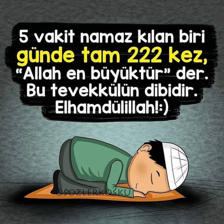 5 vakit Namaz kılan biri günde tam 222 kez, “Allah en büyüktür” der. Bu tevvekkülün dibidir. Elhamdülillah 🙂